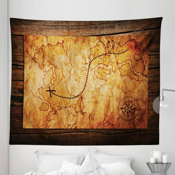 Map Tapestry Dated Old Map In Dense Color On Wooden Background Hide Out Shores Art Design Fabric Wall Hanging Decor For Bedroom Living Room Dorm 5 Sizes Orange Brown By Ambesonne
